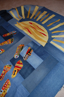 scrape the wonder under off(thank goodness that worked because I would resign as a quilter and become a knitter if I had to start this sucker over). And then holding the piece up and my family each having negative comments....They were all right. So, I modified the sun, added some more pieces and finally got it right. Not right, but just improved from the bad spot I was in. I breathed a little tonight but know I have yet to start the quilting. And I wasn't a bit relieved when the next comment was-this is the biggest thing you have worked on in a long time.